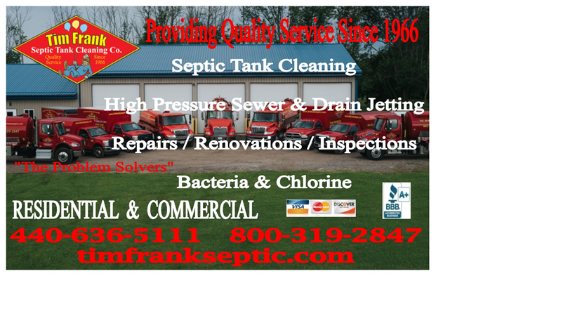 For more information, visit the Tim Frank Septic Tank Cleaning Co. website or call 440-636-5111.